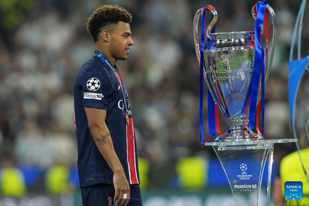 Desire Doue of Paris Saint-Germain eyes on the trophy during the awarding ceremony after the UEFA Champions League final match between Paris Saint-Germain and Inter Milan in Munich, Germany, May 31, 2025. (Xinhua/Peng Ziyang)
