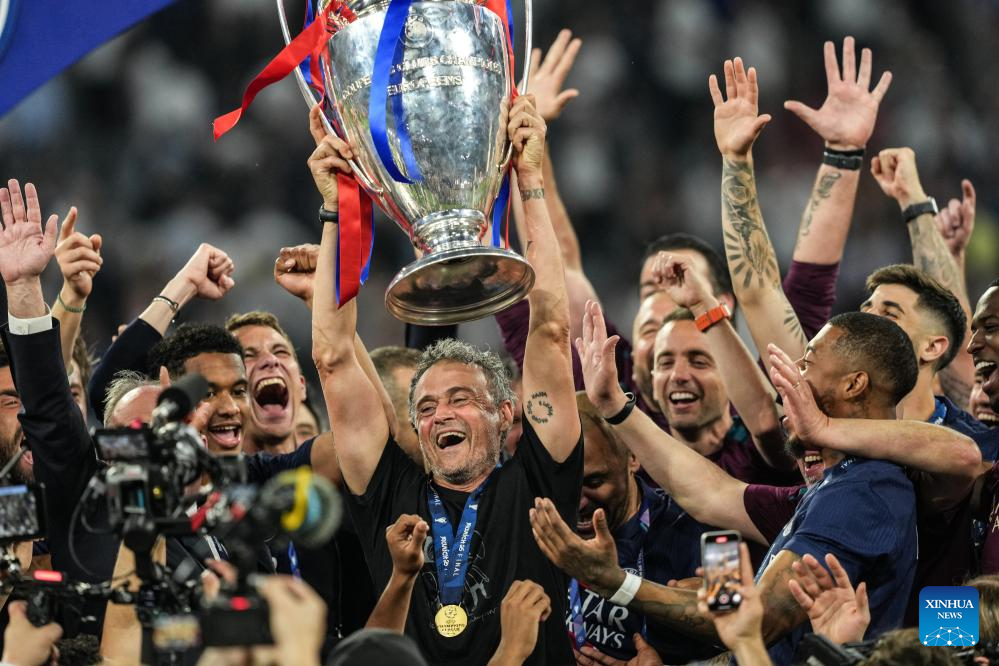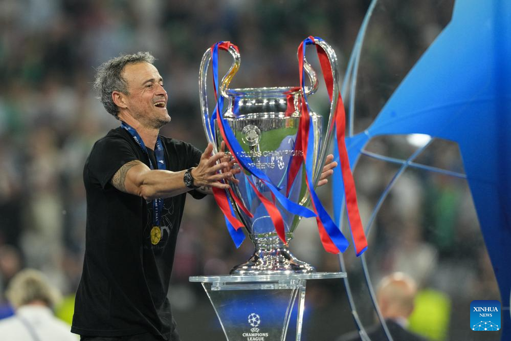 Head coach Luis Enrique (C) of Paris Saint-Germain holds up the trophy to celebrate after the UEFA Champions League final match between Paris Saint-Germain and Inter Milan in Munich, Germany, May 31, 2025. (Xinhua/Peng Ziyang)