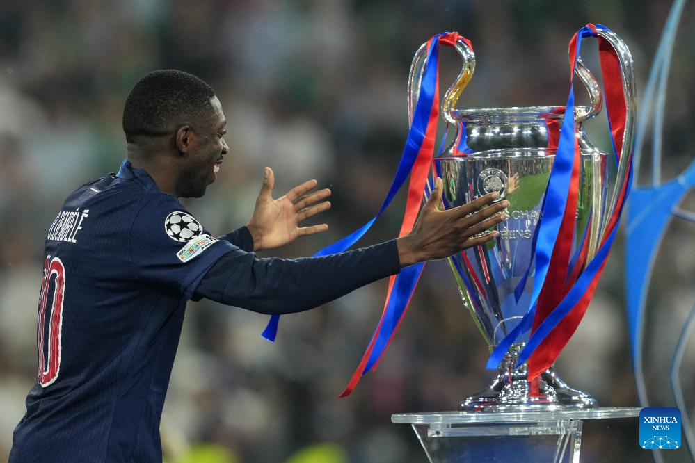 Ousmane Dembele of Paris Saint-Germain hugs the trophy during the awarding ceremony after the UEFA Champions League final match between Paris Saint-Germain and Inter Milan in Munich, Germany, May 31, 2025. (Xinhua/Peng Ziyang)