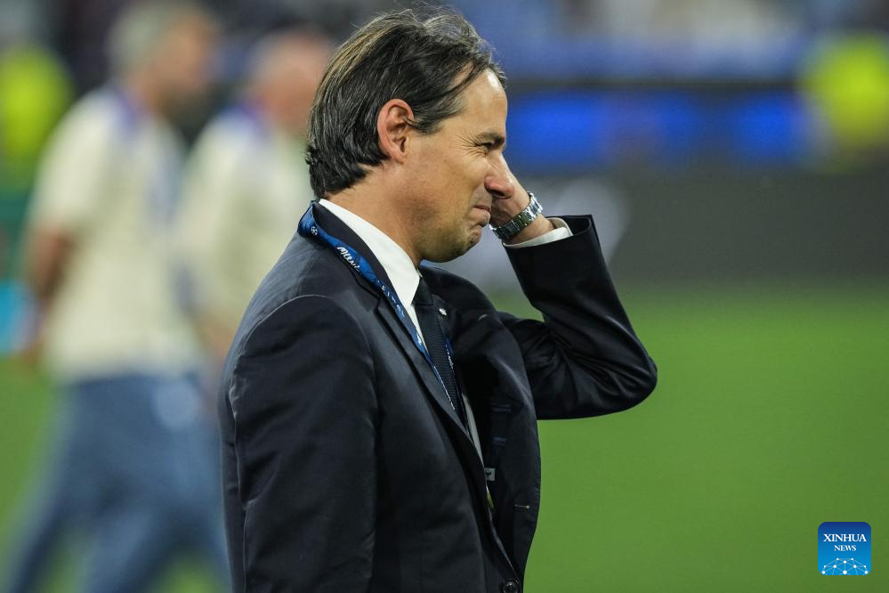 Head coach Simone Inzaghi of Inter Milan reacts during the awarding ceremony after the UEFA Champions League final match between Paris Saint-Germain and Inter Milan in Munich, Germany, May 31, 2025. (Xinhua/Peng Ziyang)