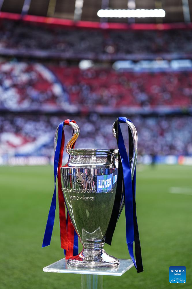 The trophy is displayed on the pitch before the UEFA Champions League final match between Paris Saint-Germain and Inter Milan in Munich, Germany, May 31, 2025. (Xinhua/Peng Ziyang)