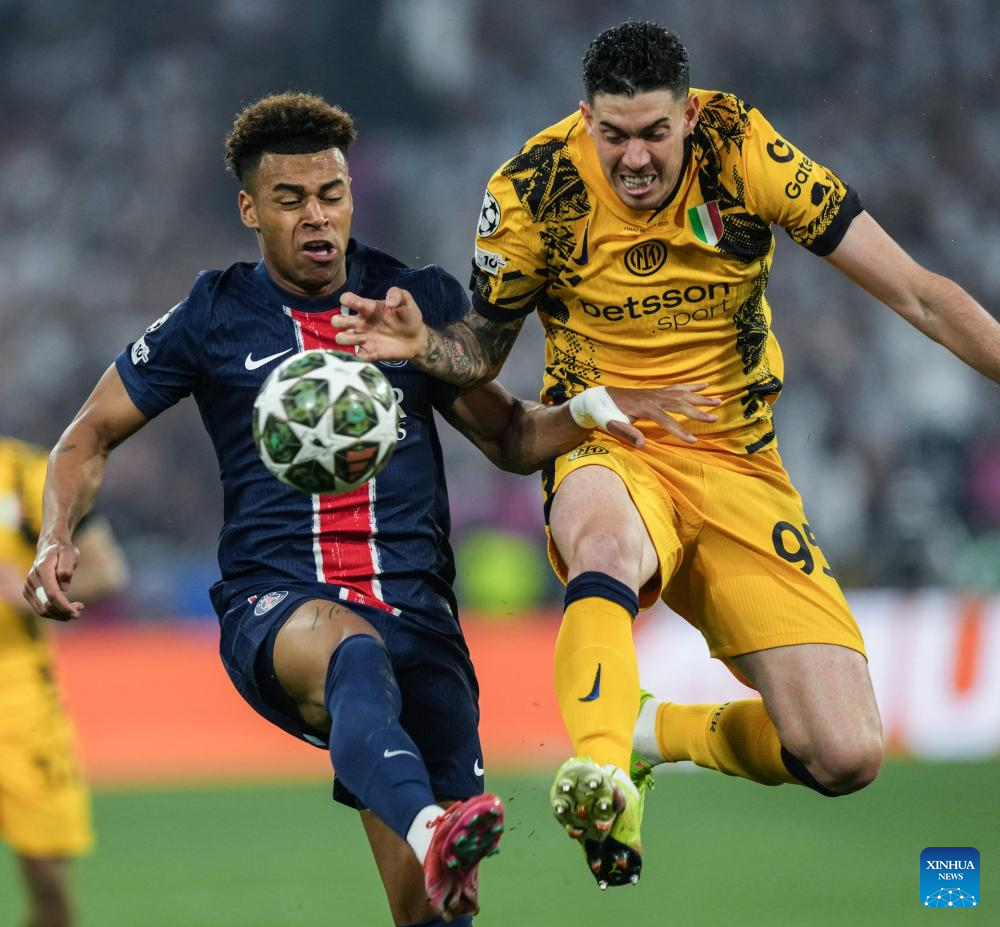Desire Doue (L) of Paris Saint-Germain vies with Alessandro Bastoni of Inter Milan during the UEFA Champions League final match between Paris Saint-Germain and Inter Milan in Munich, Germany, May 31, 2025. (Xinhua/Peng Ziyang)