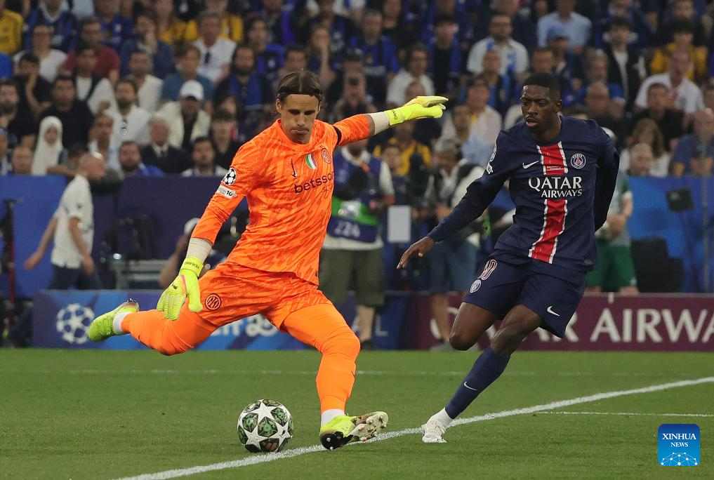 Inter Milan's goalkeeper Yann Sommer (L) shoots past Ousmane Dembele of Paris Saint-Germain during the UEFA Champions League final match between Paris Saint-Germain and Inter Milan in Munich, Germany, May 31, 2025. (Photo by Philippe Ruiz/Xinhua)