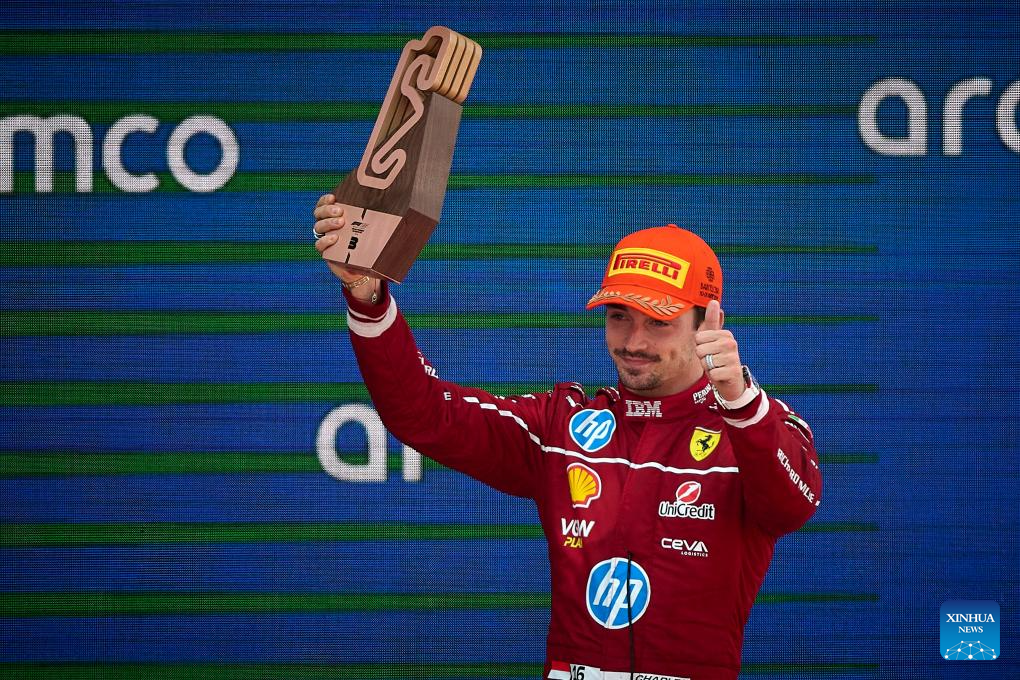 Third-placed Ferrari's driver Charles Leclerc of Monaco celebrates on the podium after the 2025 Formula One Spanish Grand Prix at the Catalunya Circuit in Montmelo, near Barcelona, Spain, June 1, 2025. (Photo by Pablo Morano/Xinhua)