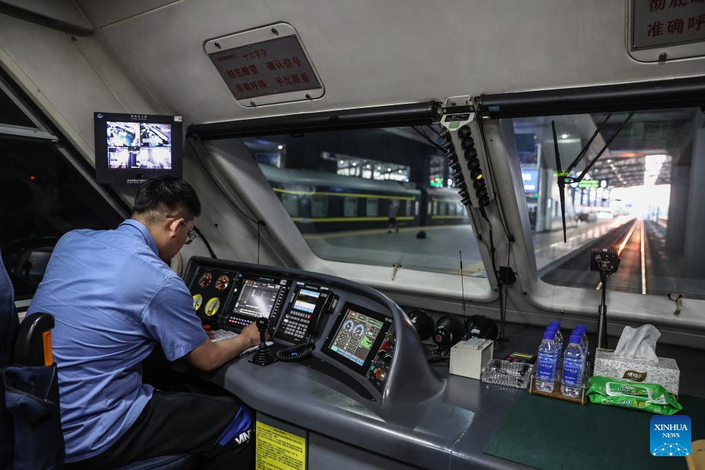 A staff member works on an inspection train during a joint debugging and testing on the high-speed railway connecting Shenyang, capital of northeast China's Liaoning Province, and Changbai Mountain reserve in the neighboring Jilin Province, June 1, 2025. With a length of 430 kilometers and design speed of 350 kilometers per hour, the high-speed railway will significantly improve regional connectivity and boost tourism and economic development upon operation. (Xinhua/Pan Yulong)