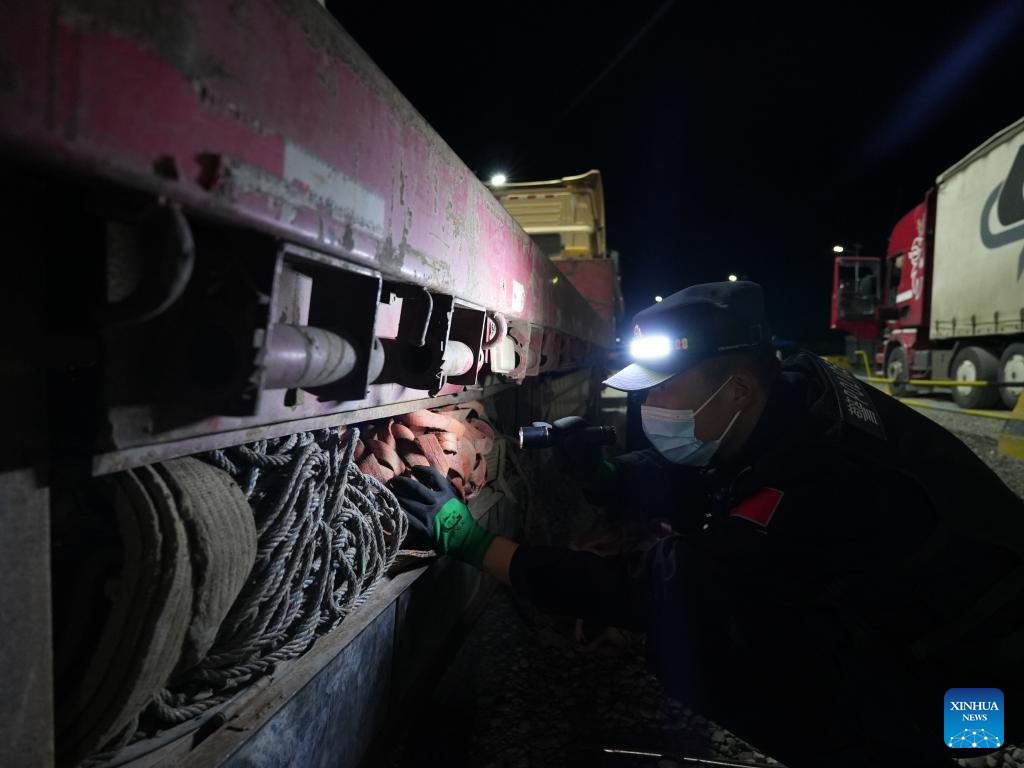An immigration officer conducts inspection work at Irkeshtam port in Wuqia County, Kirgiz Autonomous Prefecture of Kizilsu in northwest China's Xinjiang Uygur Autonomous Region, June 2, 2025. The Irkeshtam port in northwest China's Xinjiang Uygur Autonomous Region launched a trial of 24-hour freight clearance operations on Sunday, making it the second land port in the region and the first in southern Xinjiang to adopt such a system. This move is aimed at enhancing trade logistics between China and Central Asia, according to the local immigration inspection station. (Photo by Fei Qiang/Xinhua)