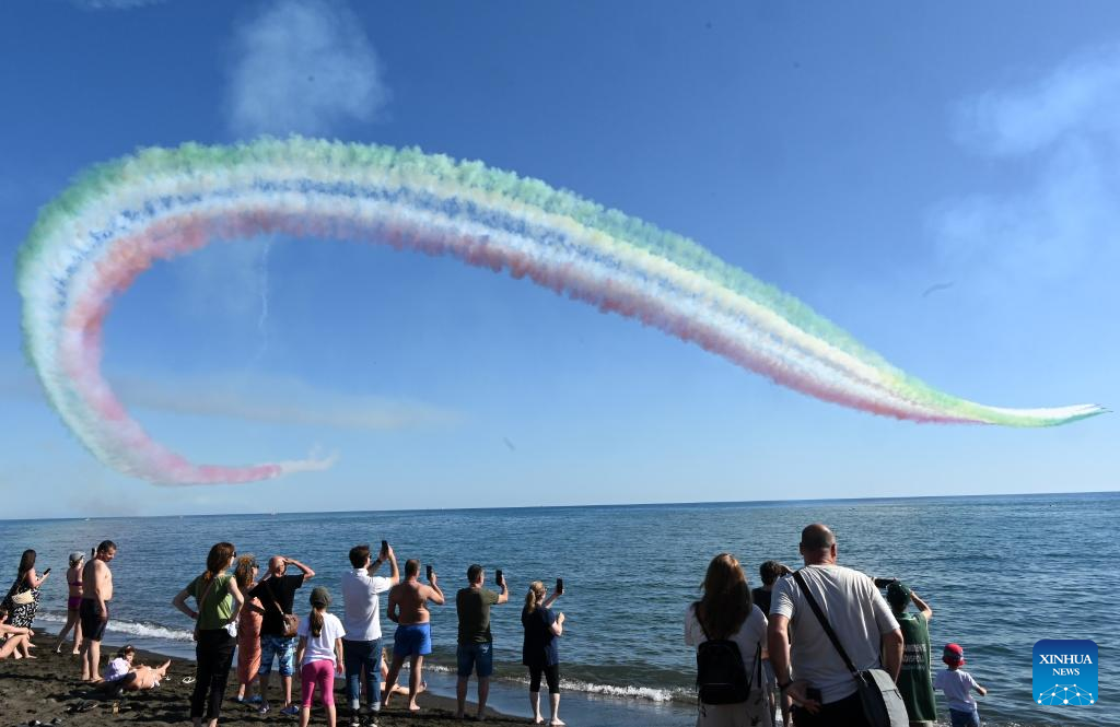 Aircraft of the Italian aerobatic squad Frecce Tricolori perform during an air show in Ladispoli, Rome, Italy, June 1, 2025. (Photo by Alberto Lingria/Xinhua)