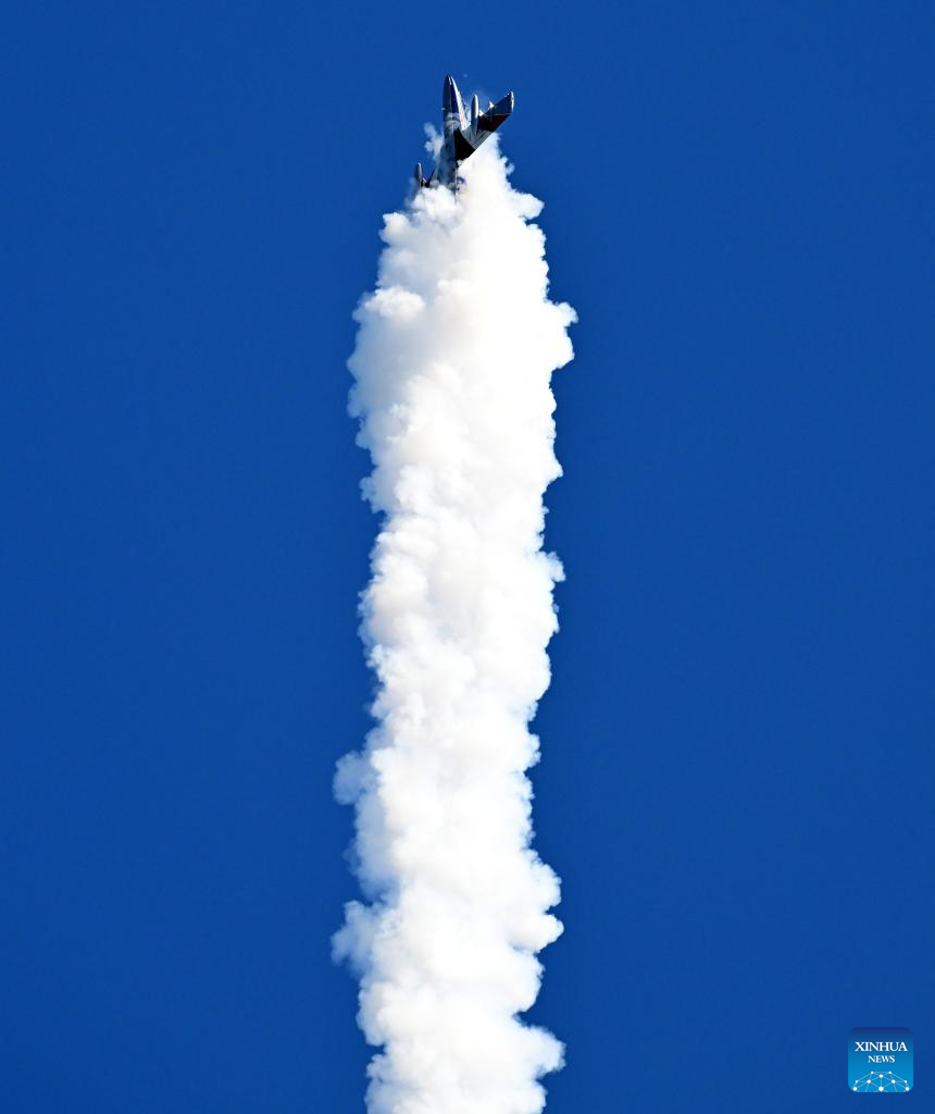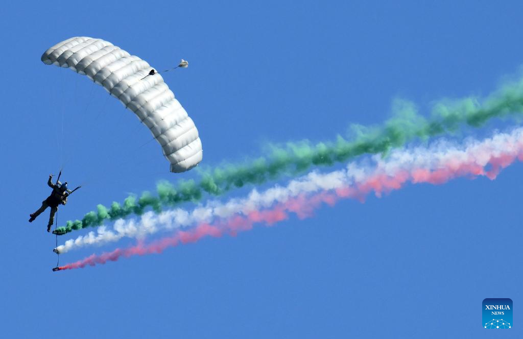 A member of the Italian aerobatic squad Frecce Tricolori performs during an air show in Ladispoli, Rome, Italy, June 1, 2025. (Photo by Alberto Lingria/Xinhua)