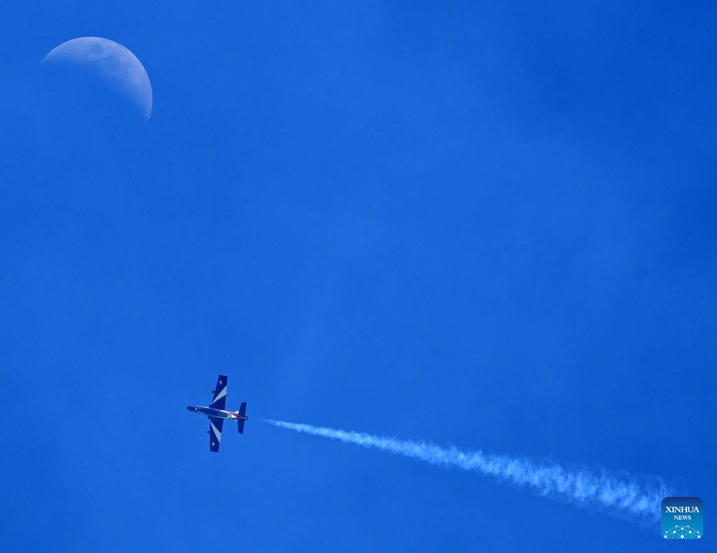 An aircraft of the Italian aerobatic squad Frecce Tricolori performs during an air show in Ladispoli, Rome, Italy, June 1, 2025. (Photo by Alberto Lingria/Xinhua)