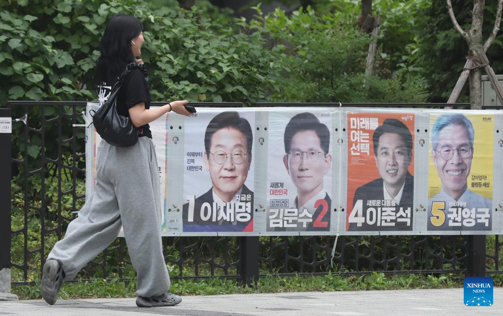 A pedestrian walks past a campaign poster of presidential candidates in Seoul, South Korea, June 2, 2025. South Korea will hold its presidential election on June 3. (Xinhua/Yao Qilin)