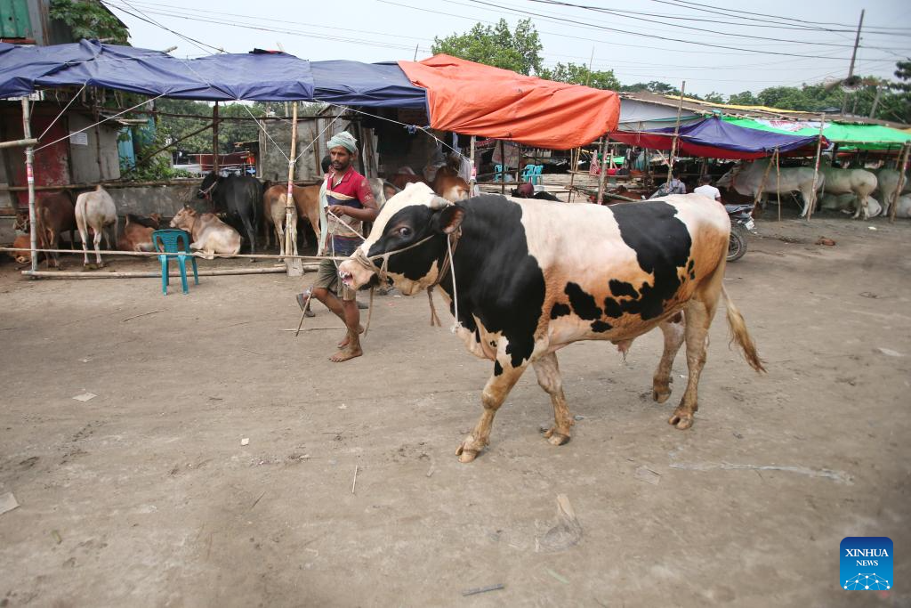 A man leads a cow at a local market in Dhaka, Bangladesh, June 2, 2025. With the Muslim festival of Eid al-Adha just around the corner, Dhaka's cattle markets stand prepared for the influx of buyers. (Photo by Habibur Rahman/Xinhua)