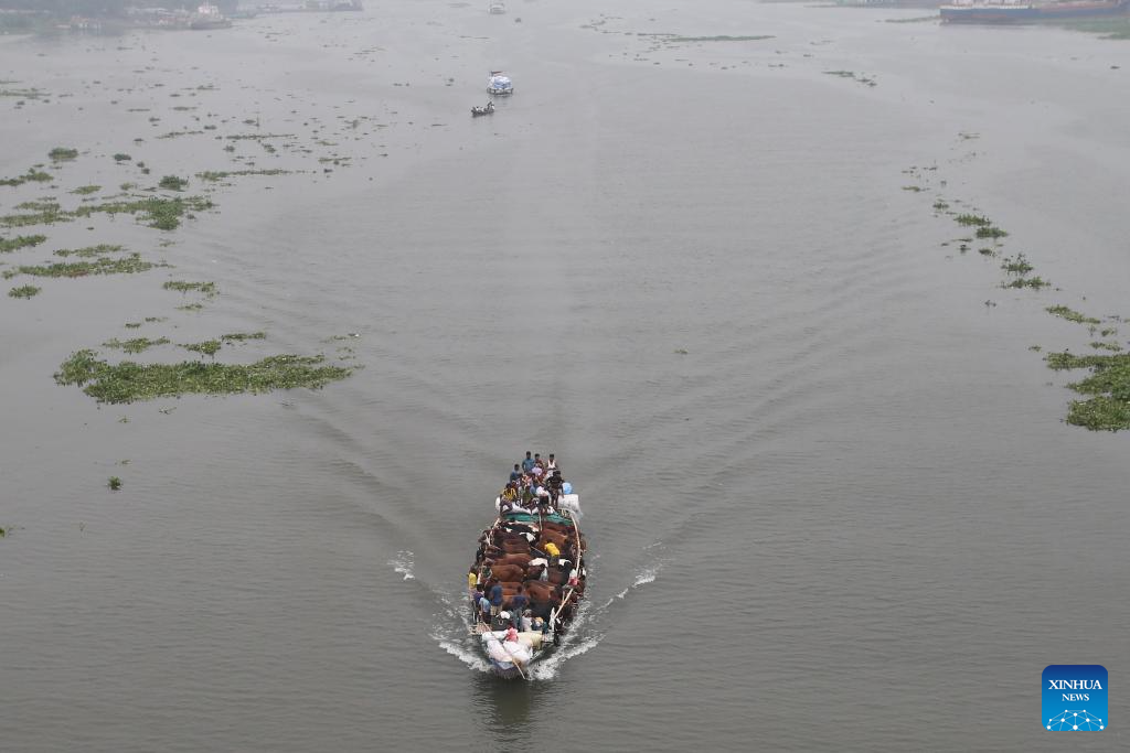 People transfer cattle to the local market by boat in Dhaka, Bangladesh, June 2, 2025. With the Muslim festival of Eid al-Adha just around the corner, Dhaka's cattle markets stand prepared for the influx of buyers. (Photo by Habibur Rahman/Xinhua)
