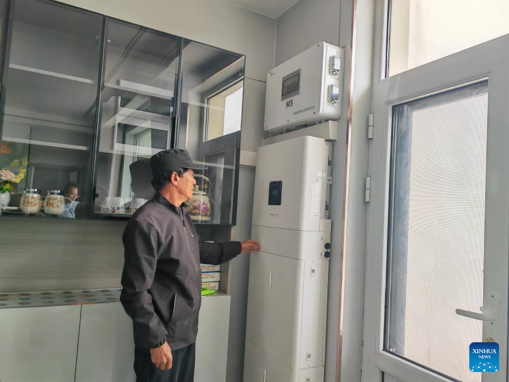 Villager Zhou Xuelin shows the energy storage device at his home in Xingsheng Village of Pingluo County, Shizuishan, northwest China's Ningxia Hui Autonomous Region, May 7, 2025. (Xinhua/Ai Fumei)