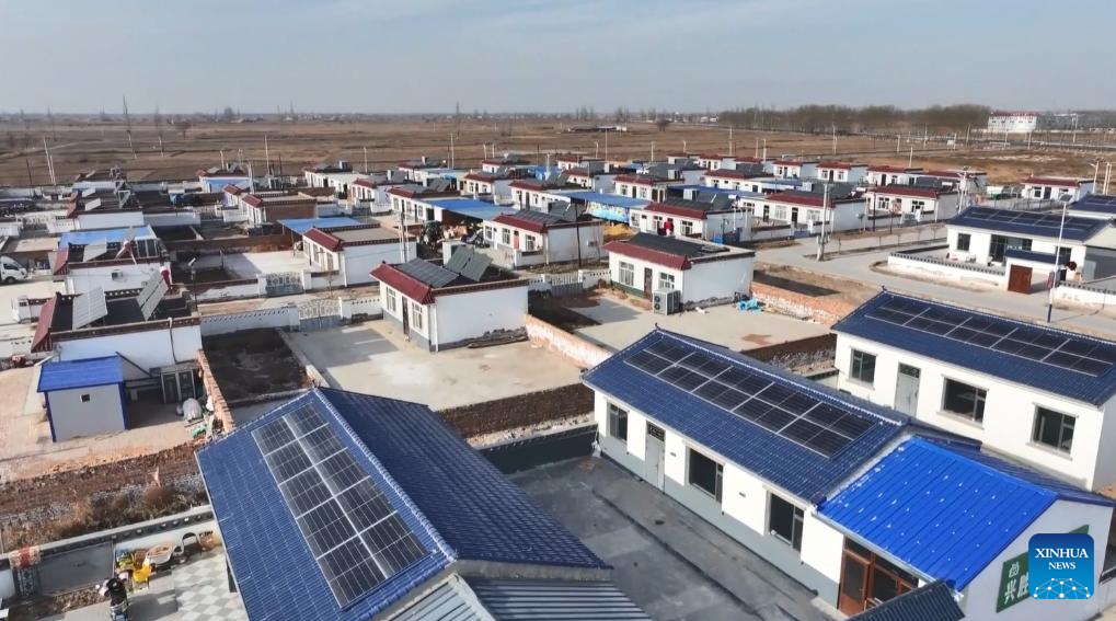 This undated aerial drone photo shows houses equipped with photovoltaic power panels in Xingsheng Village of Pingluo County, Shizuishan, northwest China's Ningxia Hui Autonomous Region. (Xinhua)