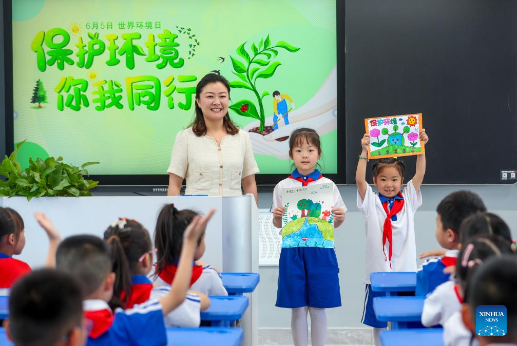 Students display paintings themed on environmental protection at a primary school in Xinghua City, east China's Jiangsu Province, on June 4, 2025. Various events are held to raise people's awareness of environmental protection in China ahead of World Environment Day, which falls on June 5. (Photo by Zhou Shegen/Xinhua)