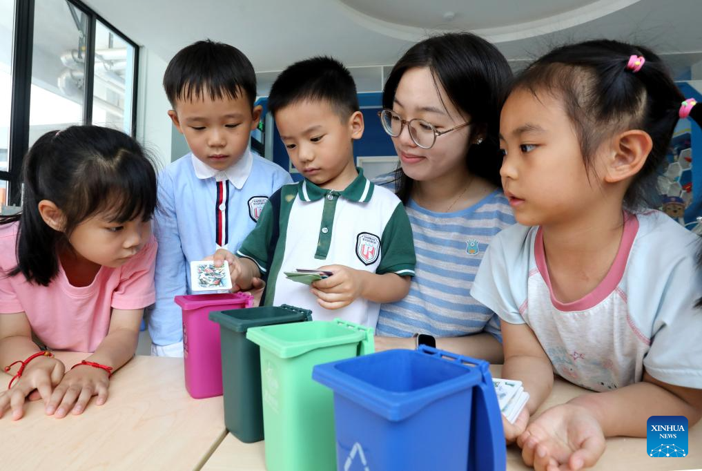 Children take part in a waste-sorting simulation at a kindergarten in Suzhou, east China's Jiangsu Province, on June 3, 2025. Various events are held to raise people's awareness of environmental protection in China ahead of World Environment Day, which falls on June 5. (Photo by Hang Xingwei/Xinhua)