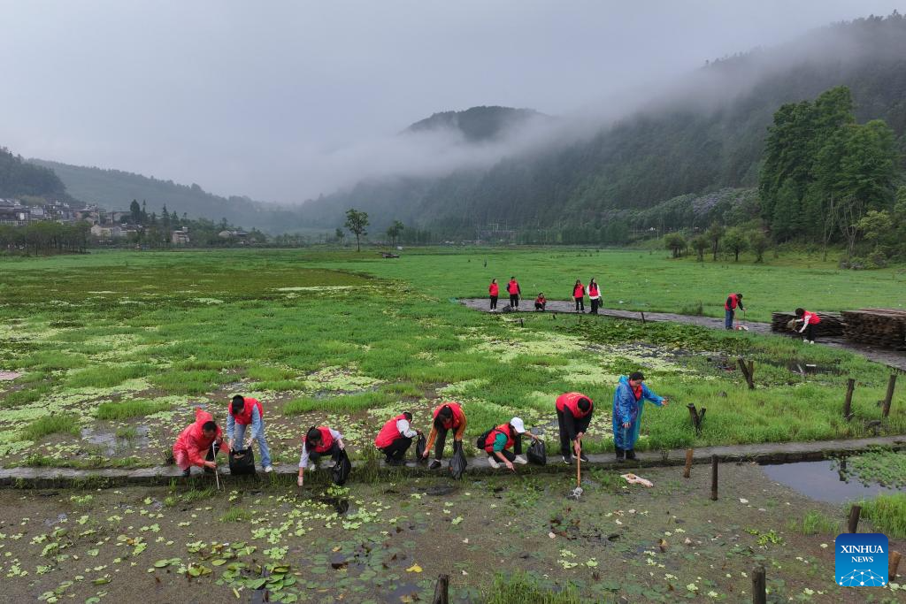 An aerial drone photo taken on June 4, 2025 shows volunteers collecting wastes at a wetland park in Tengchong, southwest China's Yunnan Province. Various events are held to raise people's awareness of environmental protection in China ahead of World Environment Day, which falls on June 5. (Photo by Gong Zujin/Xinhua)