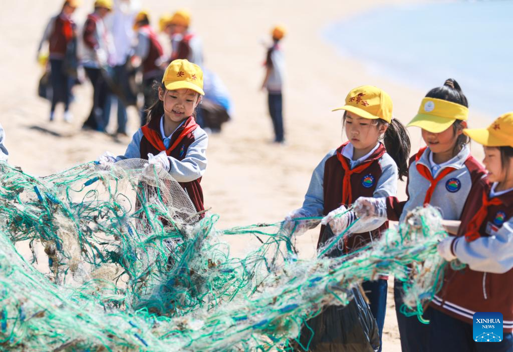 Primary school students clean up garbage at Binhai Park in Rongcheng City, east China's Shandong Province, on June 4, 2025. Various events are held to raise people's awareness of environmental protection in China ahead of World Environment Day, which falls on June 5. (Photo by Li Xinjun/Xinhua)