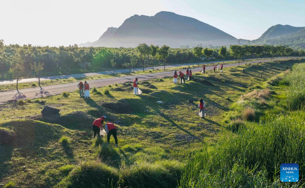An aerial drone photo taken on June 4, 2025 shows volunteers collecting wastes along a riverbank in Zunhua City, north China's Hebei Province. Various events are held to raise people's awareness of environmental protection in China ahead of World Environment Day, which falls on June 5. (Photo by Liu Mancang/Xinhua)