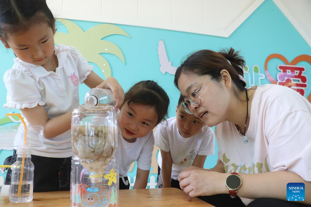 Children use waste bottles to conduct a water purification experiment at a kindergarten in Gaomi City, east China's Shandong Province, on June 4, 2025. Various events are held to raise people's awareness of environmental protection in China ahead of World Environment Day, which falls on June 5. (Photo by Li Haitao/Xinhua)