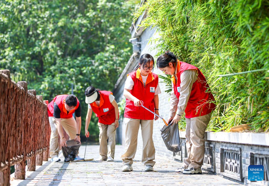 Volunteers collect wastes by a river in Yangzhou, east China's Jiangsu Province, on June 4, 2025. Various events are held to raise people's awareness of environmental protection in China ahead of World Environment Day, which falls on June 5. (Photo by Ren Fei/Xinhua)