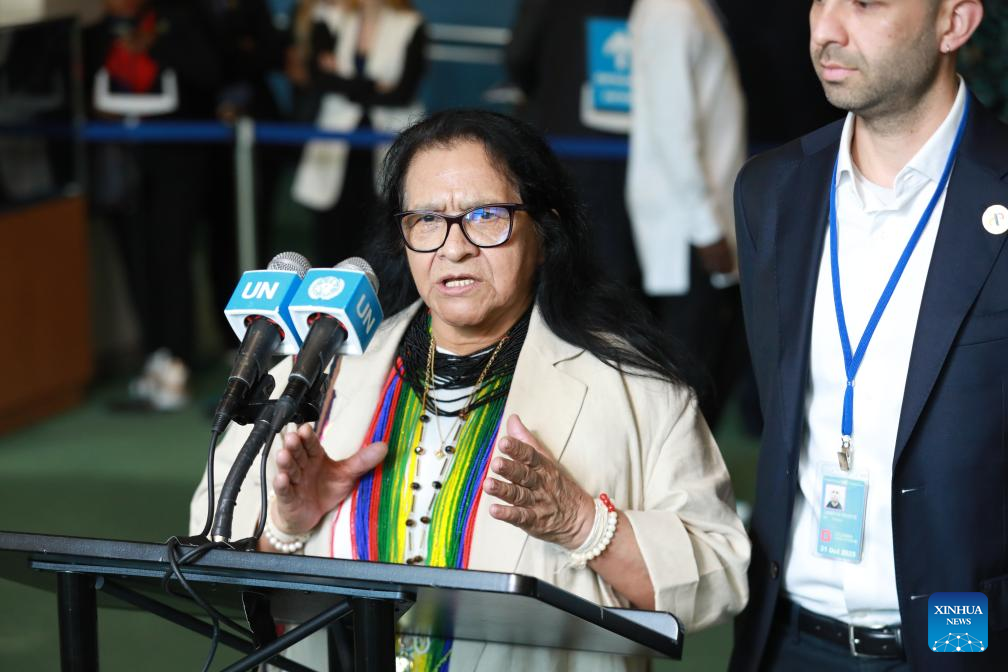 Permanent Representative of Colombia to the United Nations Leonor Zalabata Torres speaks to the press after Colombia was elected as a non-permanent member of the UN Security Council at the UN headquarters in New York, on June 3, 2025. Bahrain, Colombia, the Democratic Republic of the Congo (DRC), Latvia and Liberia were elected non-permanent members of the UN Security Council on Tuesday for a two-year term running from Jan. 1, 2026 to Dec. 31, 2027. (Xinhua/Xie E)