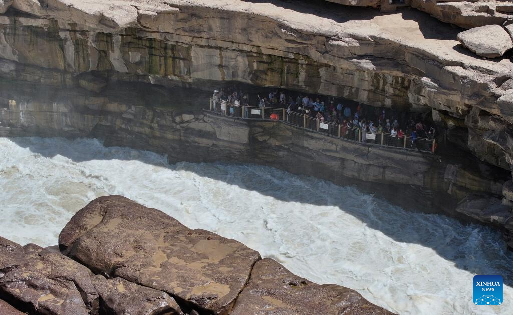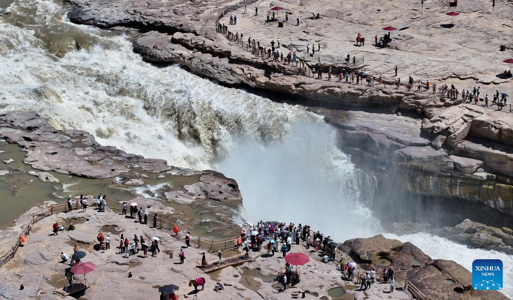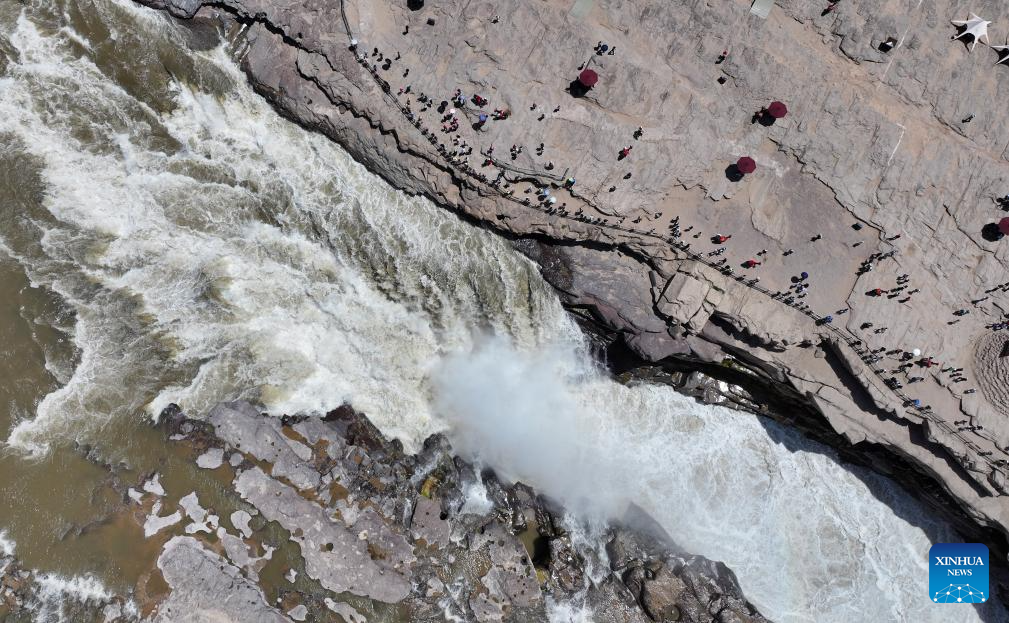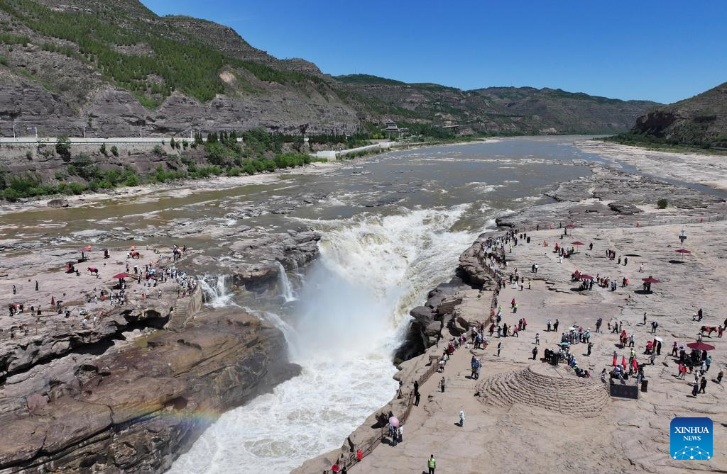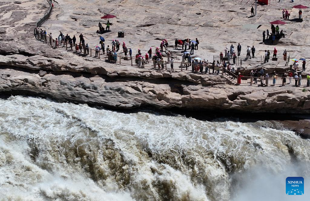 An aerial drone photo taken on June 4, 2025 shows tourists visiting the Hukou Waterfall on the Yellow River on the border between north China's Shanxi Province and northwest China's Shaanxi Province. (Xinhua/Zhang Bowen)