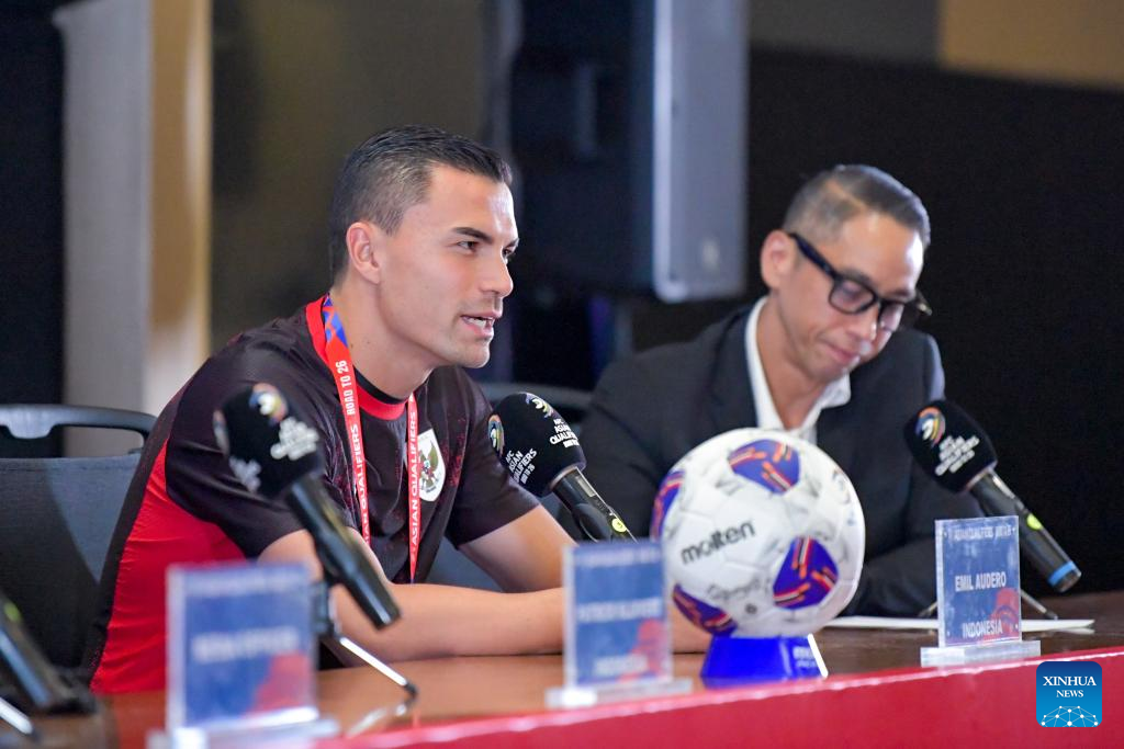 Indonesia's Emil Audero (L) speaks during a press conference in Jakarta, Indonesia, June 4, 2025, one day ahead of the 2026 FIFA World Cup Asian Qualifiers Group C match between China and Indonesia. (Xinhua/Xu Qin)