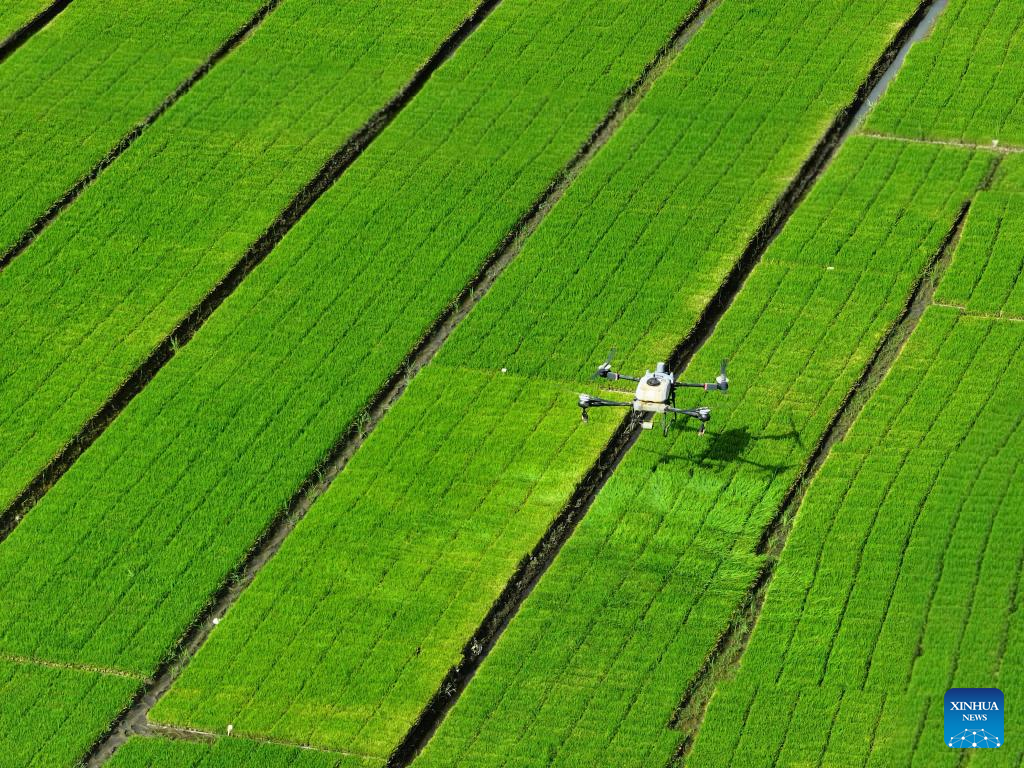 An aerial drone photo taken on May 16, 2025 shows a drone flying above the fields at the "Tianfu granary" core demonstration zone in Chongzhou, southwest China's Sichuan Province. A smart agriculture competition, running from May 15 to Sept. 30, pits six human farming teams against four AI-assisted groups across 1,000 mu (or 66.7 hectares) of prime Sichuan farmland. This modern-day duel between tradition and technology offers a window into China's quest for smart agriculture.(Xinhua)