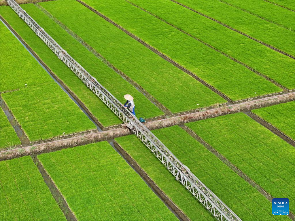 CHENGDU, June 4 (Xinhua) -- Under the golden June sun, emerald rice paddies ripple across the "Tianfu granary" core demonstration zone in Chongzhou, southwest China's Sichuan Province, where a high-stakes agricultural experiment unfolds.