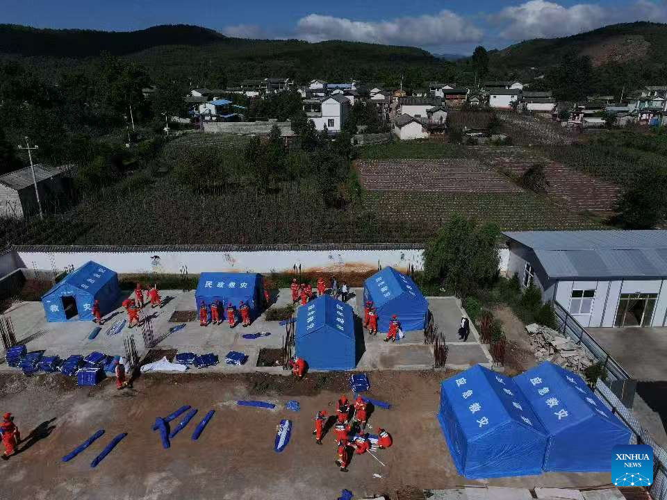 This drone photo shows rescuers setting up temporary shelters at Baicao Village of Eryuan County in Dali Bai Autonomous Prefecture, southwest China's Yunnan Province, June 5, 2025.