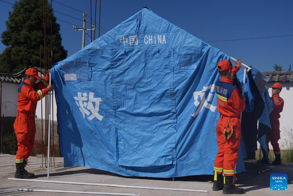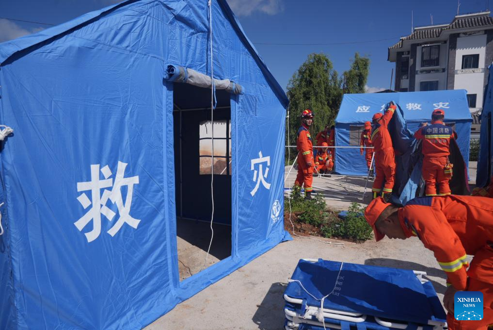 Rescuers set up a temporary shelter at Baicao Village of Eryuan County in Dali Bai Autonomous Prefecture, southwest China's Yunnan Province, June 5, 2025.