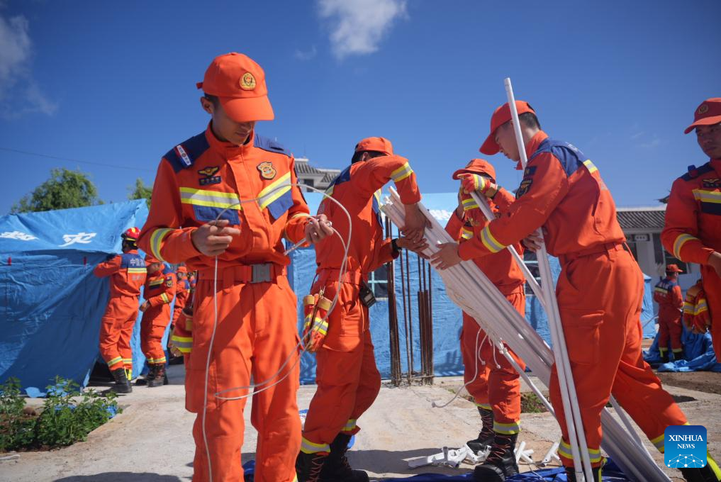 Rescuers set up temporary shelters at Baicao Village of Eryuan County in Dali Bai Autonomous Prefecture, southwest China's Yunnan Province, June 5, 2025.