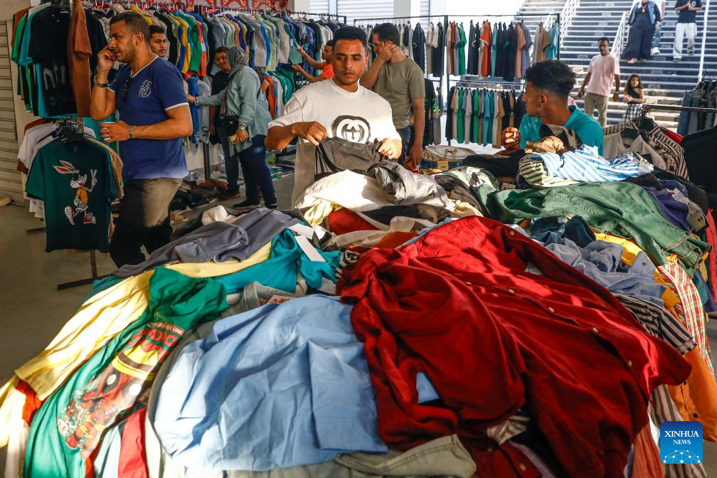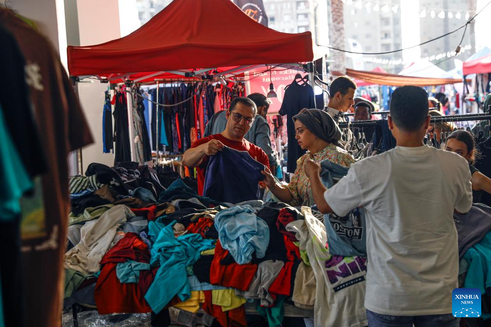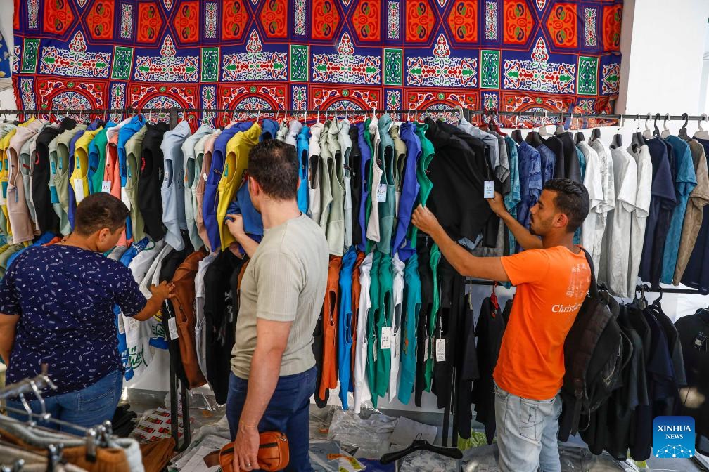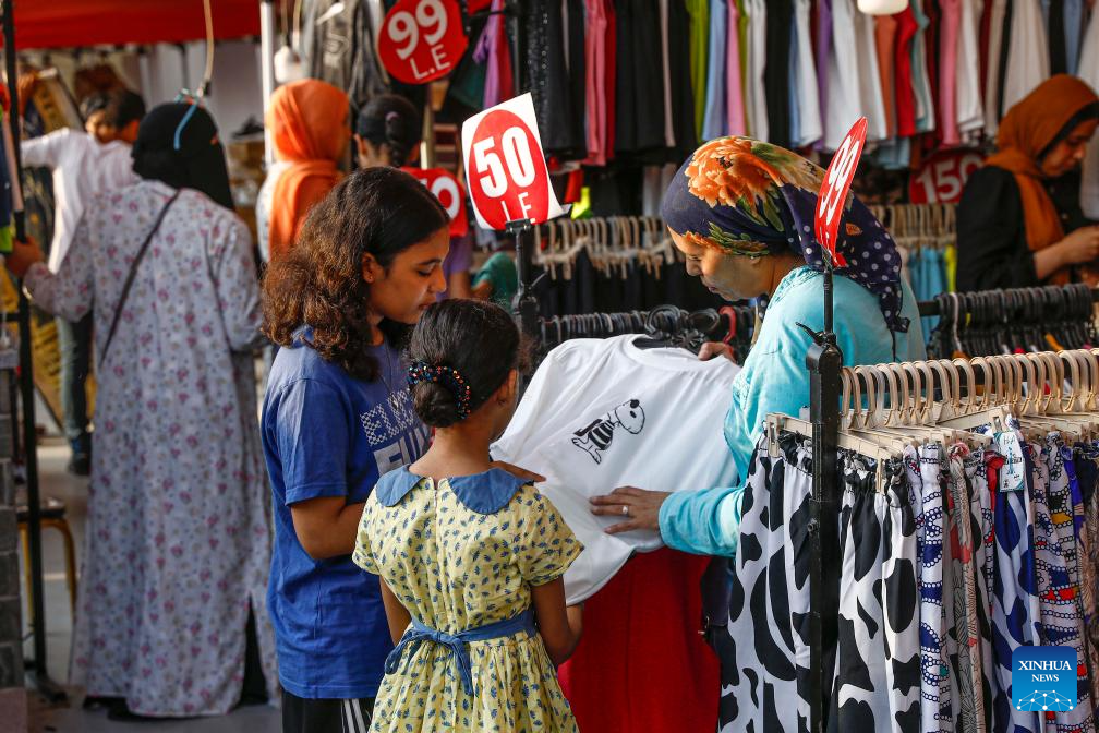 People shop at a discounted clothing fair in Cairo, Egypt, on June 4, 2025. Despite the economic challenges in Egypt, an undercurrent of optimism runs through the streets. Shopkeepers notice an increase in the number of local residents seeking new garments to celebrate the upcoming festivities on June 6. (Xinhua/Ahmed Gomaa)