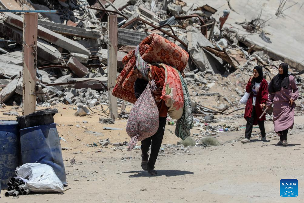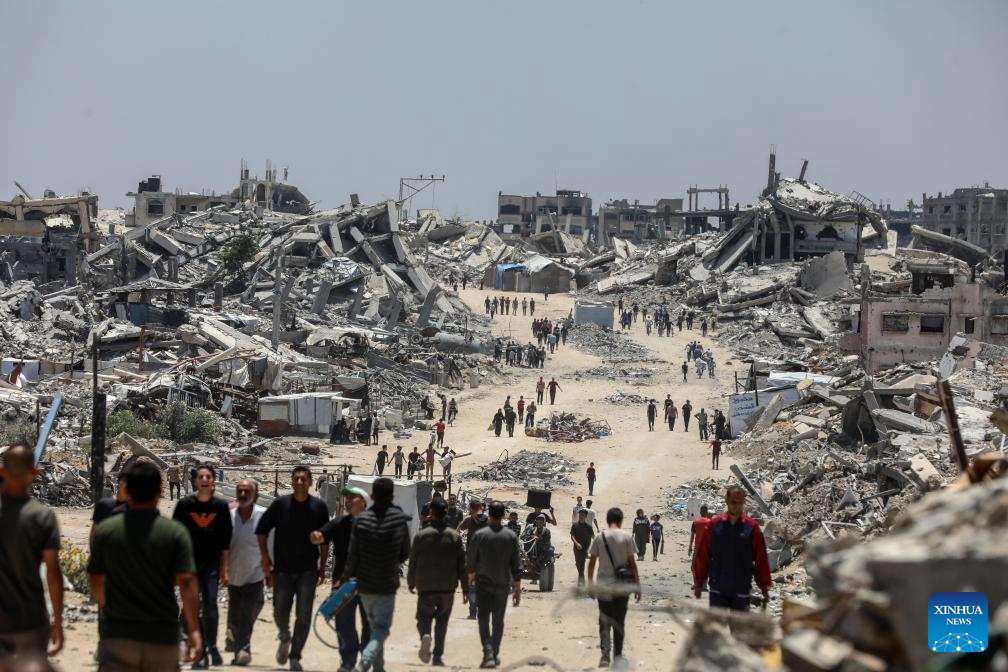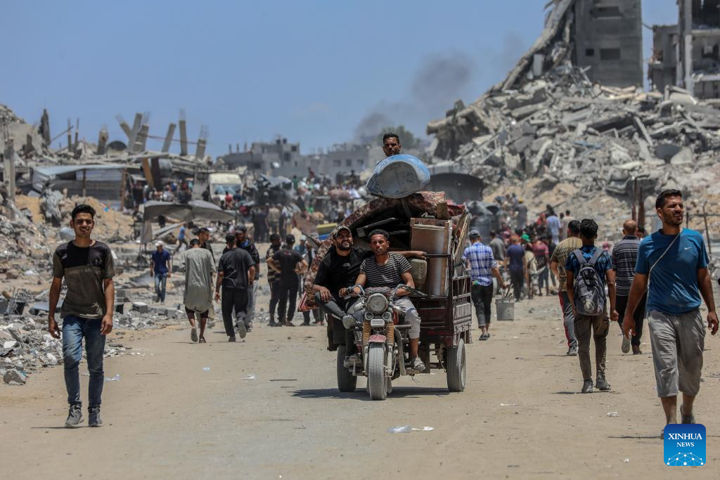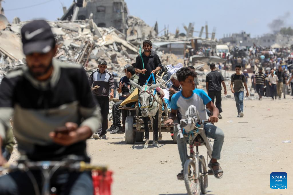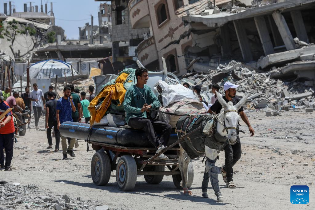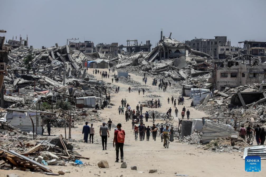 Returning Palestinians are seen in the town of Beit Lahia, northern Gaza Strip, on June 4, 2025. The Israel Defense Forces (IDF) on Wednesday night issued an urgent warning to residents of the Gaza Strip to avoid moving northward for their safety. IDF spokesman Avichay Adraee addressed Gazan residents who have returned or intend to return to Beit Lahia, Jabalia, and Beit Hanoun, all north of Gaza City, on social media X, warning that the IDF is operating in these areas with "heavy force." (Photo by Rizek Abdeljawad/Xinhua)