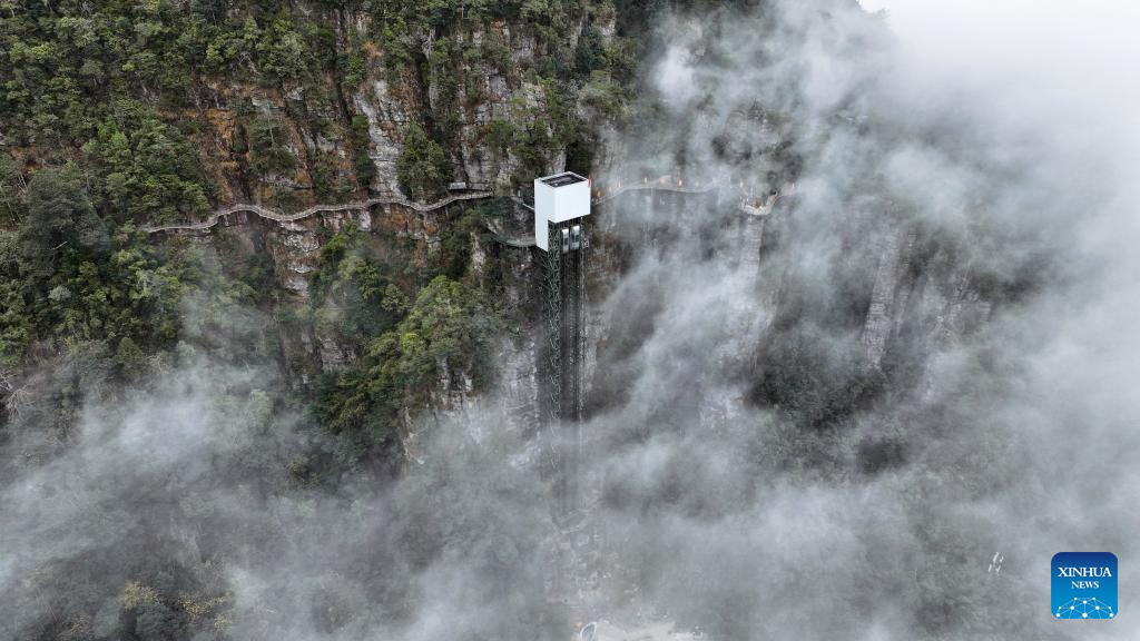This undated file drone photo shows the twin elevators in Panwang Realm scenic spot in Dayao Mountains, south China's Guangxi Zhuang Autonomous Region. (Xinhua)