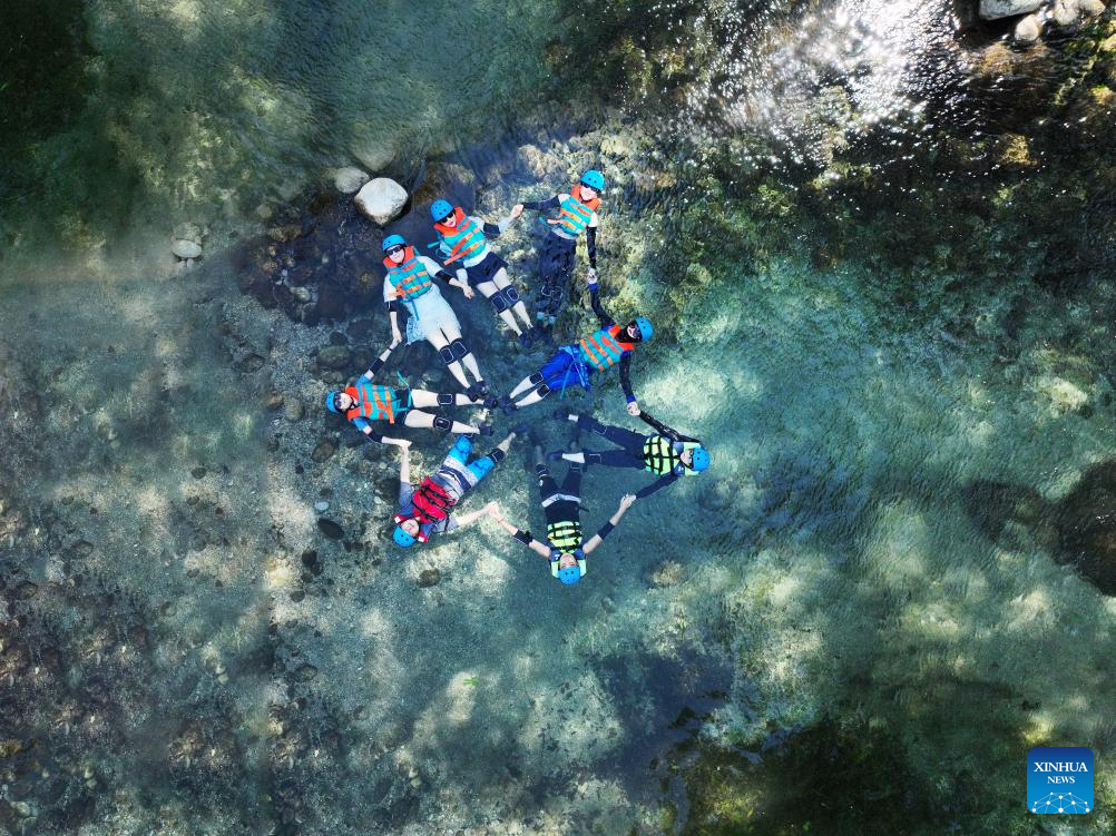 An undated aerial drone photo shows tourists "Wimp Rafting" in Mao'er Mountain Scenic Area, Guilin, south China's Guangxi Zhuang Autonomous Region. (Xinhua)