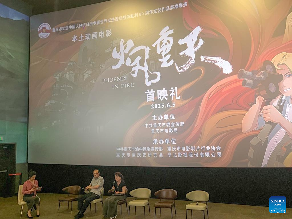 "Phoenix in Fire," an animated film portraying China's resistance against Japanese aggression during World War II, premieres at a cinema in Yuzhong District of southwest China's Chongqing, June 5, 2025. Titled "Phoenix in Fire," the film opened at a cinema in Chaotianmen of Yuzhong District, a landmark location that was once a bustling riverside dock area and later reduced to rubble during the Japanese bombings of the war. (Xinhua/Zhou Siyu)