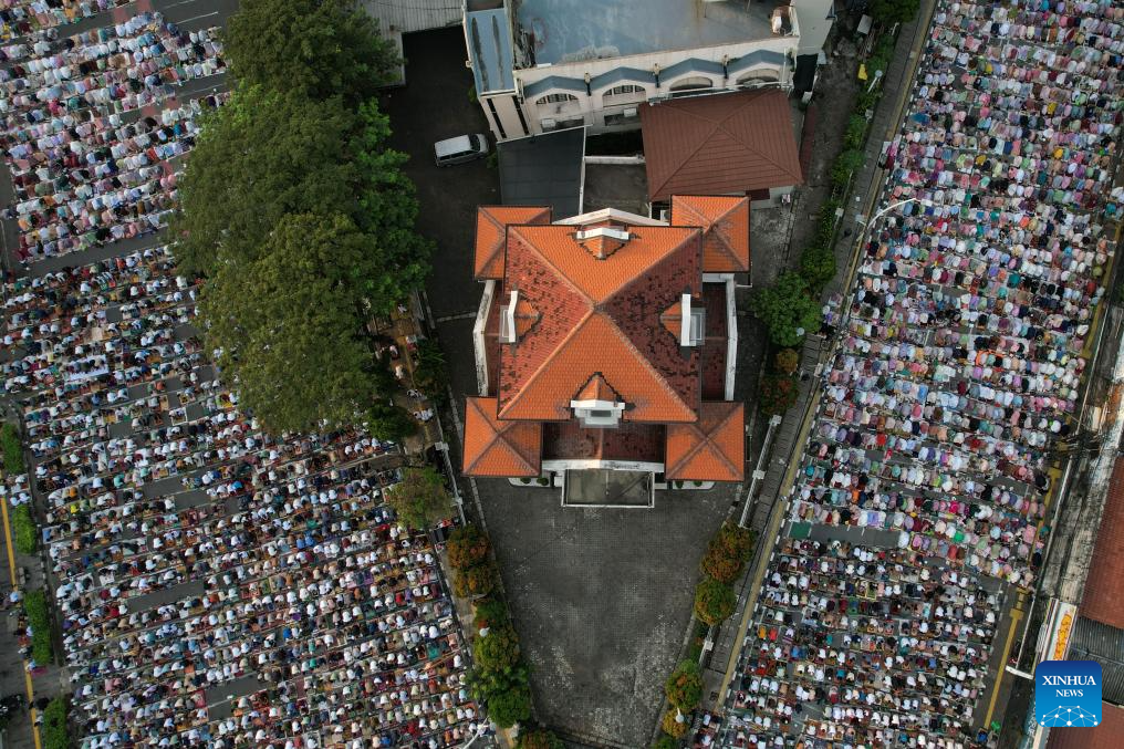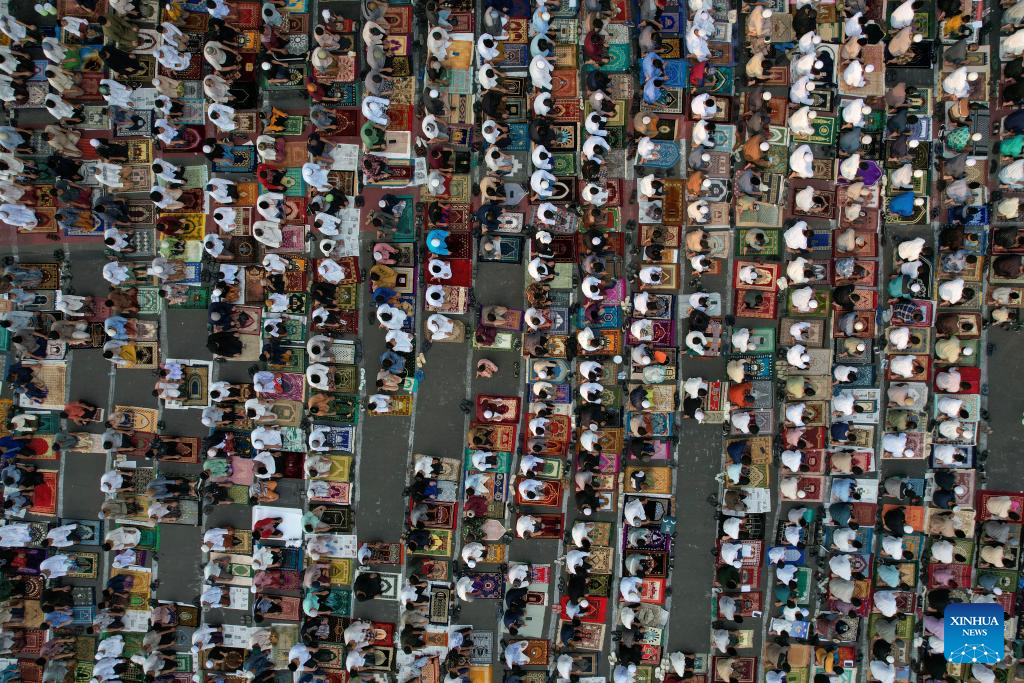 An aerial drone photo shows people performing Eid al-Adha prayer at Jatinegara in Jakarta, Indonesia on June 6, 2025. (Xinhua/Veri Sanovri)