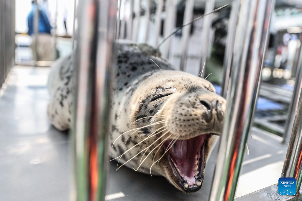 Staff members prepare to release a spotted seal in the waters off Dalian, northeast China's Liaoning Province, June 6, 2025.