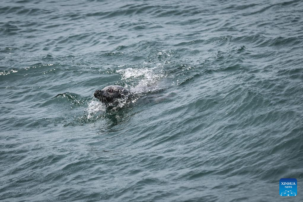 A released spotted seal swims in the waters off Dalian, northeast China's Liaoning Province, June 6, 2025.