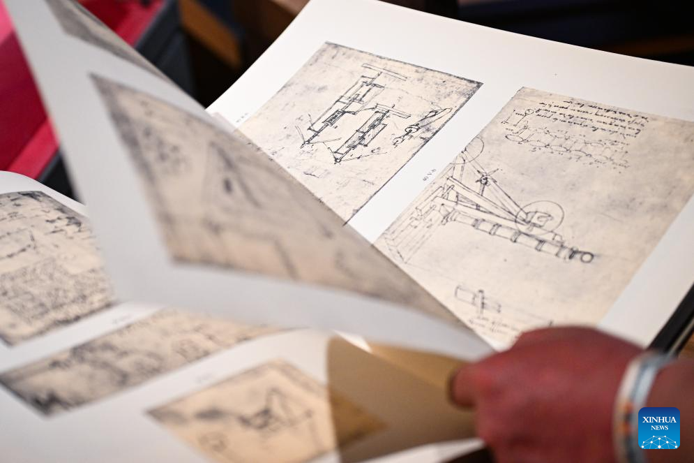 This photo taken on June 5, 2025 shows a digitally restored version of one of Leonardo da Vinci's manuscripts during the exhibition "Harmony through Time and Space: How Leonardo da Vinci Created Concord between His Artistic and Scientific World and the Natural World" at the Natural History Museum of China in Beijing, capital of China, June 5, 2025. The exhibition kicked off here on Thursday and will last until October 19. (Xinhua/Chen Zhonghao)