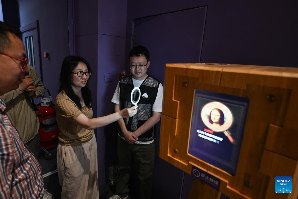 A visitor watches an image through a polarizer during the exhibition "Harmony through Time and Space: How Leonardo da Vinci Created Concord between His Artistic and Scientific World and the Natural World" at the Natural History Museum of China in Beijing, capital of China, June 5, 2025. The exhibition kicked off here on Thursday and will last until October 19. (Xinhua/Chen Zhonghao)