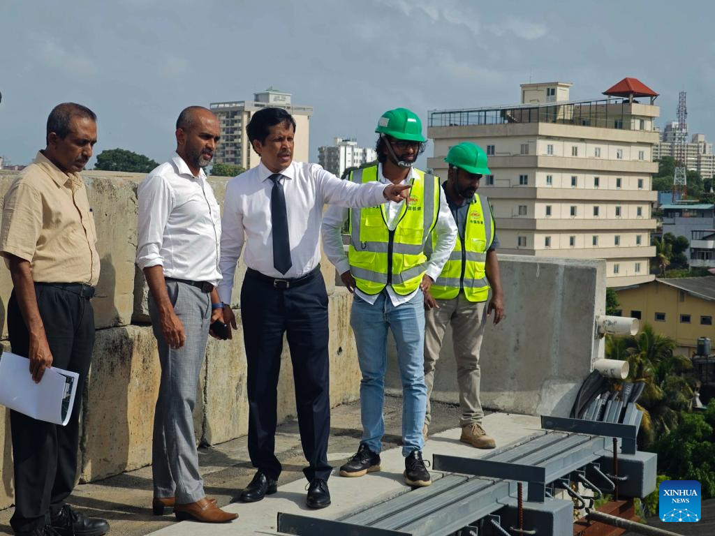 Prasanna Gunasena (2nd L), deputy minister of transport and highways, inspects the Port Access Elevated Highway project in Colombo, Sri Lanka, on June 6, 2025. (China Civil Engineering Construction Corporation/Handout via Xinhua)