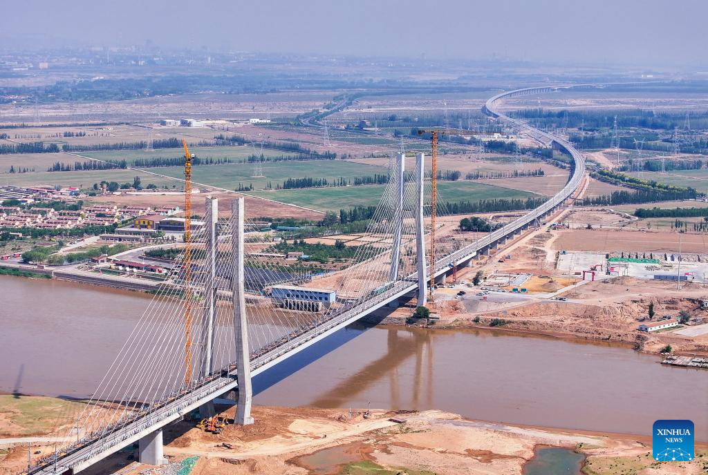 An aerial drone photo shows the construction site of the Wuhai Yellow River grand bridge in north China's Inner Mongolia Autonomous Region, June 6, 2025.