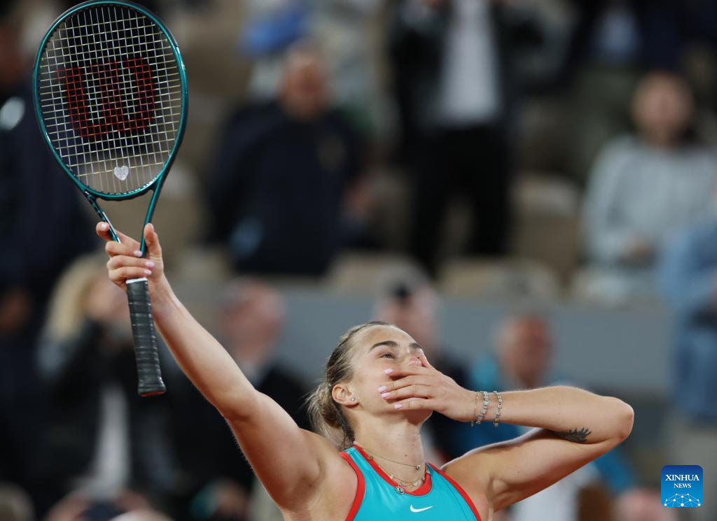 Aryna Sabalenka celebrates after winning the women's singles semifinal between Aryna Sabalenka of Belarus and Iga Swiatek of Poland at the French Open tennis tournament at Roland Garros, Paris, France, June 5, 2025. (Xinhua/Gao Jing)