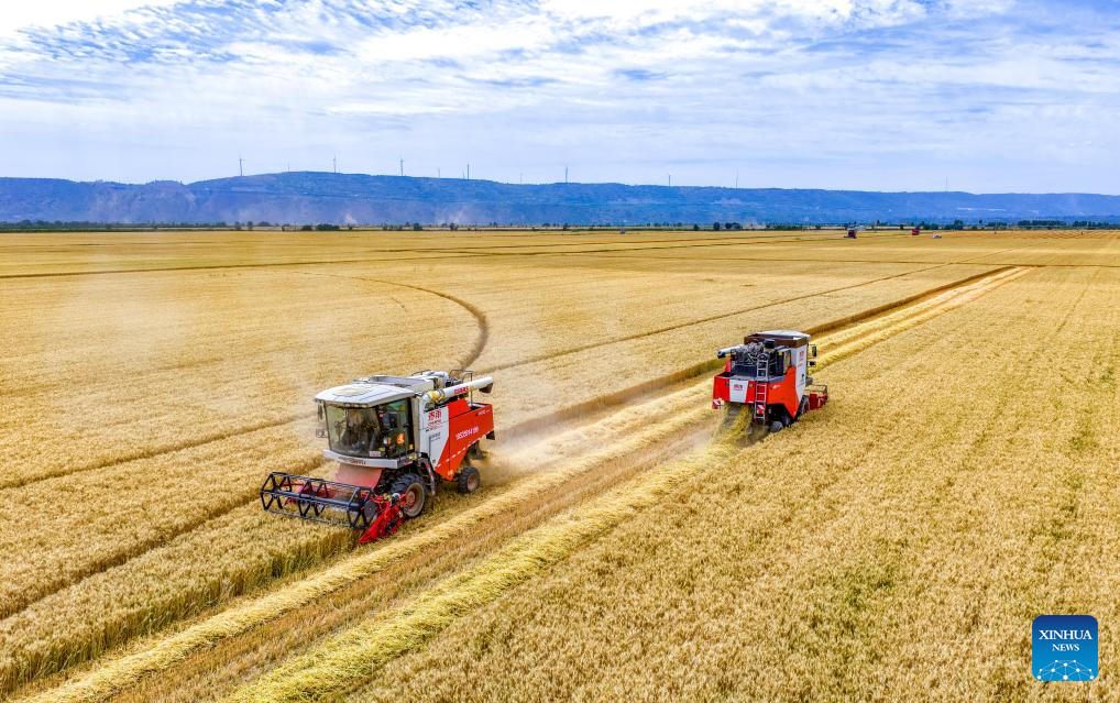 Harvesters reap wheat in the fields in Donglu Township of Ruicheng County of Yuncheng City, north China's Shanxi Province, June 4, 2025. (Photo by Xue Jun/Xinhua)