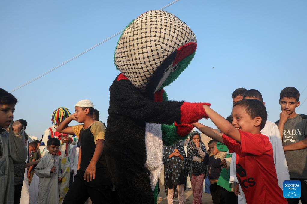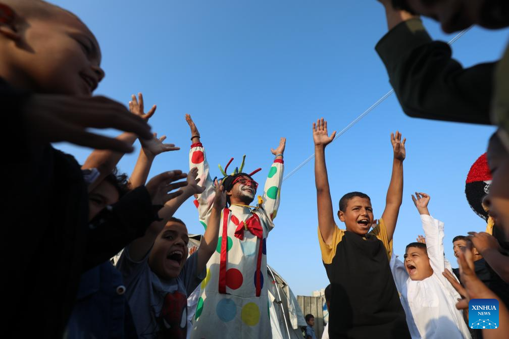 Palestinians dressed as clowns play with displaced children at a temporary shelter during Eid al-Adha in Gaza City, on June 6, 2025. (Photo by Rizek Abdeljawad/Xinhua)