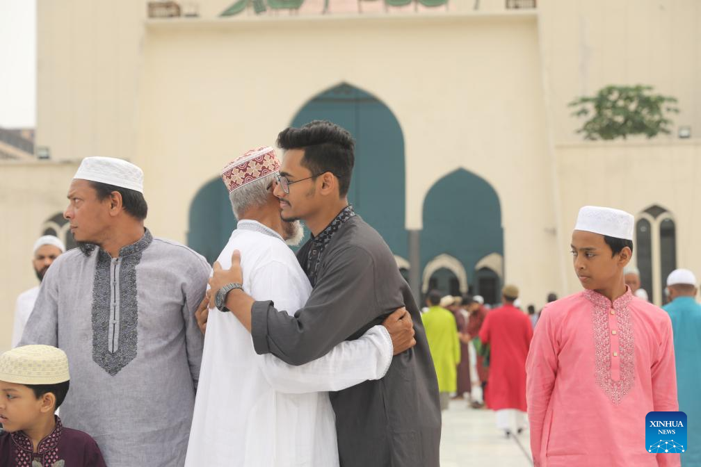 People hug each other after offering Eid al-Adha prayers in Dhaka, Bangladesh, June 7, 2025. (Photo by Habibur Rahman/Xinhua)