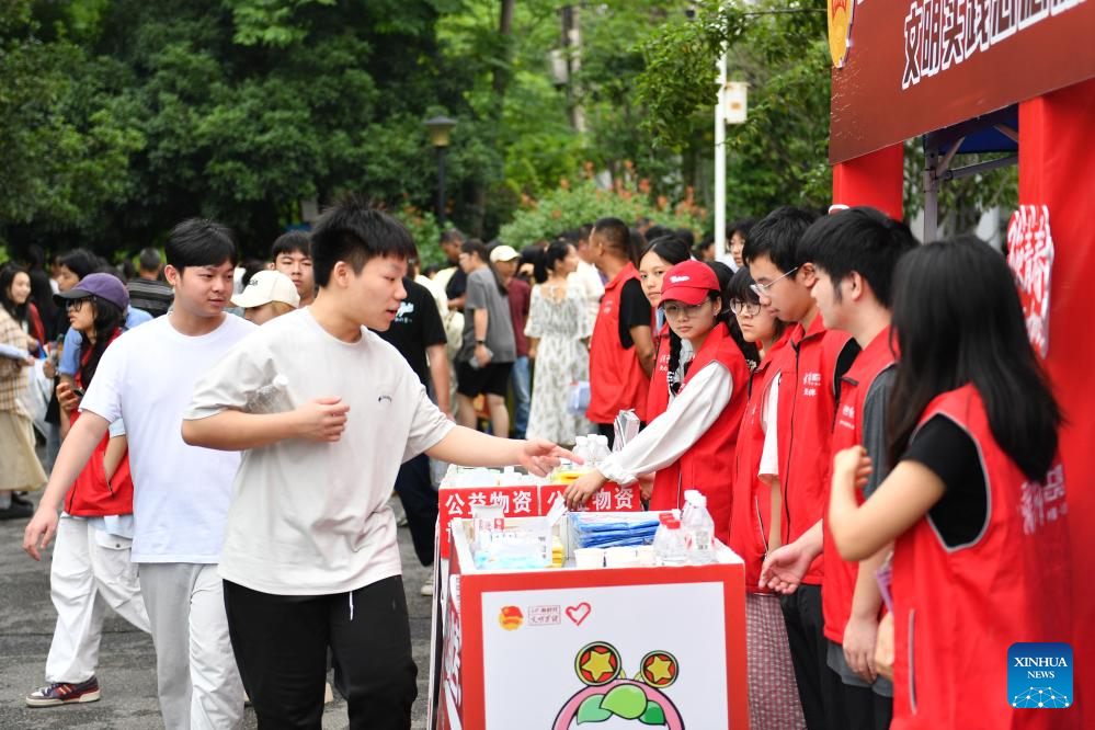 Volunteers provide bottled water to students at a national college entrance examination site in Changsha, central China's Hunan Province, June 8, 2025. Tianxin District of Changsha has organised volunteers to provide help for students and their parents at multiple local examination sites during this year's national college entrance exam. (Xinhua/Chen Zhenhai)